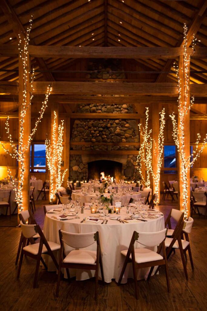 When lighting your wedding, there are many options to choose from. You can use tealights in hurricane vases to create a magical altar, or you can use string lights. When paired with dark wooden interiors, these arrangements create an eye-catching contrast. String lights can also be covered with sheer fabric to soften the look and create ethereal panels. This will create a romantic and intimate feel even in large spaces.